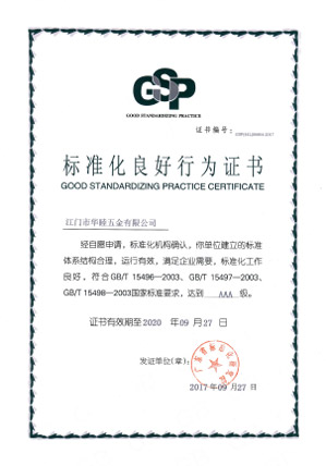 2017年9月27日,本公司之公司江門華津金屬制品有限公司(以下簡稱“華津”)及江門市華睦五金有限公司(以下簡稱“華睦”)收到由廣東省標(biāo)準(zhǔn)化研究院所頒發(fā)的《標(biāo)準(zhǔn)化良好行為證書》(證書編號分別為:GSP(44L)00603-2017 號及GSP(44L)00604-2017號)。